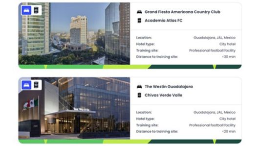 그랜드 피에스타 아메리카나 과달라하라 컨트리클럽은 과달라하라의 금융 지구에 위치해 있으며, 고급스러운 시설과 보안이 강점이다. 경기장인 아크론 스타디움까지는 차량으로 약 20~30분 거리에 있어 접근성이 뛰어나다.