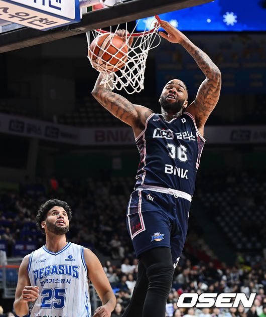 부산 KCC 숀롱이 대구 한국가스공사 베니 보트라이트의 마크를 피해 덩크슛을 성공하고 있다. 2026.01.10 / foto0307@osen.co.kr