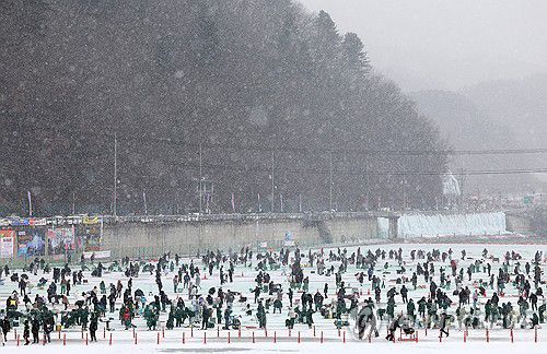(화천=연합뉴스) 양지웅 기자 = 국내 대표 겨울 축제인 2026 화천산천어축제가 개막한 10일 강원 화천군 화천읍 화천천에 마련된 축제장 일원에서 함박눈이 내리고 있다. 2026.1.10