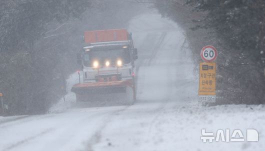 [제주=뉴시스] 우장호 기자 = 지난 2일 오전 제주시 노형동 어승생 삼거리 인근 도로에서 제설차가 눈을 치우고 있다. 2026.01.02. woo1223@newsis.com |