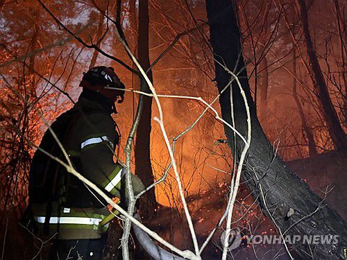 (의성=연합뉴스) 10일 오후 경북 의성군에서 대형 산불이 발생한 가운데 한 소방관이 산불을 진화하고 있다. 2026.1.10 [경북도소방본부 제공, 재판매 및 DB 금지]