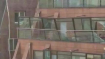 강풍으로 휘어진 구조물에 다른 유리창들도 기울어져, 곧 떨어질 것 같이 위태로운 모습입니다.