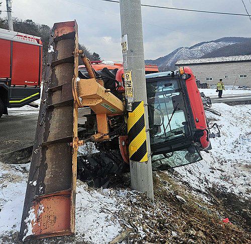 (횡성=연합뉴스) 유형재 기자 = 눈을 치우던 트랙터가 넘어지면서 운전하던 50대 주민이 깔려 심정지 상태로 병원으로 이송됐다.
