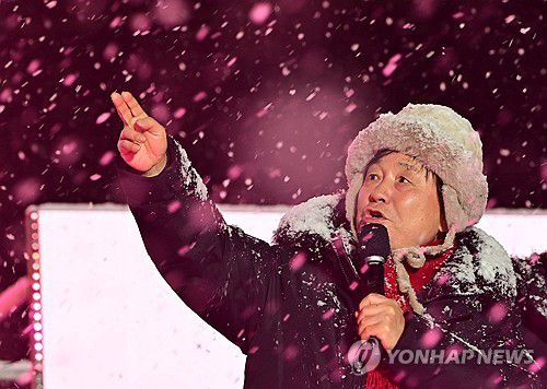 (화천=연합뉴스) 양지웅 기자 = 국내 대표 겨울 축제인 2026 화천산천어축제가 개막한 10일 강원 화천군 화천읍 화천천에 마련된 축제장 특설무대에서 최문순 군수가 환영사를 하고 있다. 2026.1.10