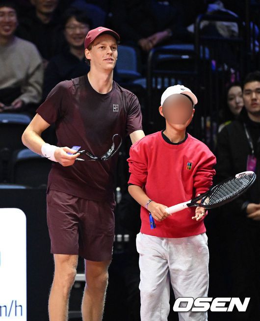 [OSEN=인천, 이대선 기자] 카를로스 알카라스(스페인)와 얀니크 신네르(이탈리아)가 벌이는 ‘현대카드 슈퍼매치 14’가 10일 오후 인천 중구 인스파이어 아레나에서 열렸다. 얀니크 신네르(2위·이탈리아)의 경기는 알카라스의 2-0(7-5 7-6<8-6>) 승리로 끝났다. 신네르가 관중석에 앉은 어린이 팬에게 라켓을 넘기고 있다. 2026.01.10 /sunday@osen.co.kr