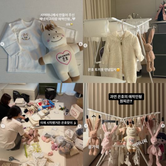 또 다른 사진에서는 아기 용품을 정리 중인 거실 풍경이 담겼다. 각종 육아용품이 한가득 펼쳐진 공간에서 은가은은 본격적인 ‘은호 맞이’에 나선 모습이다. 시어머니가 직접 만들어준 배냇저고리와 말 모양의 애착 인형에는 ‘엄마 아빠의 보물 은호’라는 문구가 자수로 새겨져 있어 눈길을 끌었다. 정성 어린 준비 과정 속에서 아이가 얼마나 큰 사랑을 받고 있는지 느껴지는 대목이다.