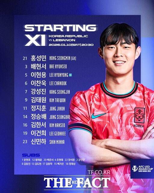 [더팩트 | 박순규 기자] 6년 만의 정상 탈환을 노리는 한국의 이민성호가 레바논과 23세 이하(U23) 아시안컵 조별리그 두 번째 경기에 나설 스타팅11을 공개했다.