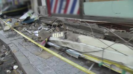 건물에서 떨어진 간판이 형태를 알아보기 어려울 정도로 부서졌습니다.