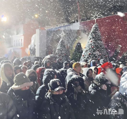 [화천=뉴시스]서백 기자= 10일 눈이.내리는 화천산천어축제 개막식장에 참석한 수많은 관광객들이 개막 공연을 보며 즐거워하고 있다.2026.1.10. syi23@newsis.com