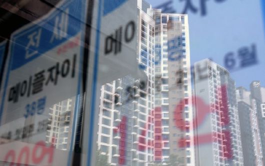 서울 시내의 한 부동산에 붙은 전세 매물 안내문에 인근 아파트 모습이 비치고 있다. [사진=연합뉴스] |