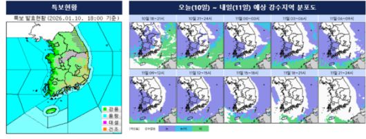 먼저, 내일은 중국 북부에서 남동쪽으로 확장하는 차가운 고기압과 함께 기압골의 영향을 받아 전국에 많은 눈과 비가 내릴 것으로 전망된다. 오늘(10일) 밤까지 강원산지와 충청권, 전북동부, 경북북부는 시간당 1~3cm의 강한 눈이 집중되겠고, 특히 충남과 전라권, 경남서부내륙, 제주도에는 내일 새벽(00~06시)부터 오전(06~12시) 사이 5cm 이상의 폭설이 내릴 가능성이 있다.