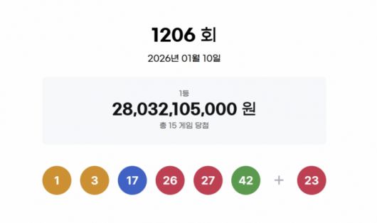 10일 실시한 제1206회 로또 1등 당첨 번호는 '1·3·17·26·27·42'로 결정됐다. 2등 보너스 번호는 '23'이다.