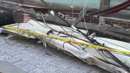 주변에는 함께 떨어져나온 벽돌과 철제 구조물 등이 가득합니다.