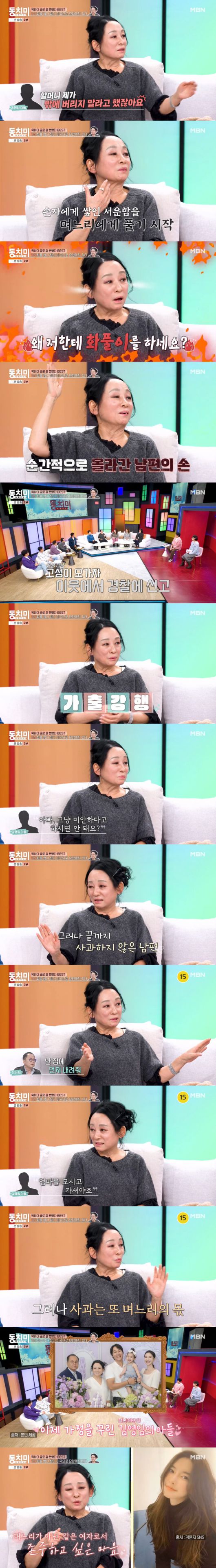 김영임은 "시어머니가 미국 집에 잠깐 오셨다. 미국은 상자를 함부로 버리면 안 된다. 아들이 '할머니 치우지 마셔라'고 했는데, 시어머니가 대수롭지 않게 여겨 박스를 내놓았다. 학교에 가던 아들이 박스를 보고 할머니한테 화를 냈다"며 "어머니가 손자에 쌓인 서운함을 나한테 풀길래 '왜 나한테 화풀이 하냐'고 했더니 남편이 노발대발 하더라. 고성에 학교 가던 아들까지 돌아왔다"고 했다.