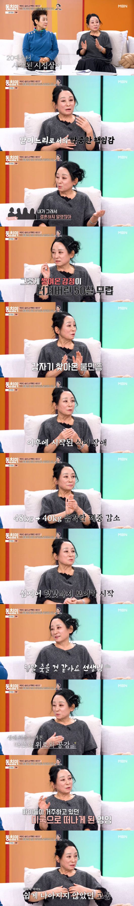 김영임은 "할 수 있는 건 그냥 참는 것 뿐이었다. 그러다 50살 무렵에 쌓여왔던 감정이 터져버렸다"며 갑자기 불면증이 찾아오고 이후에 식이장애가 시작되고 몸무게도 48kg에서 40kg까지 빠졌다고 털어놨다.