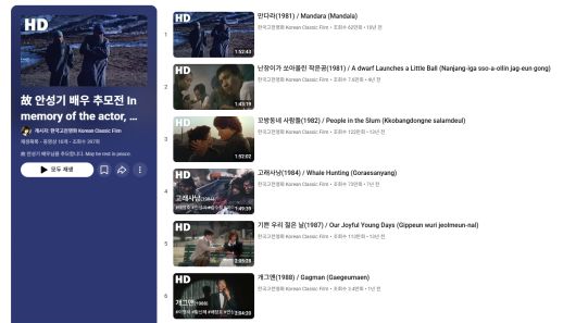 한국영상자료원의 고(故) 안성기 배우 온라인추모전. 유튜브 채널 '한국고전영화' 화면 |