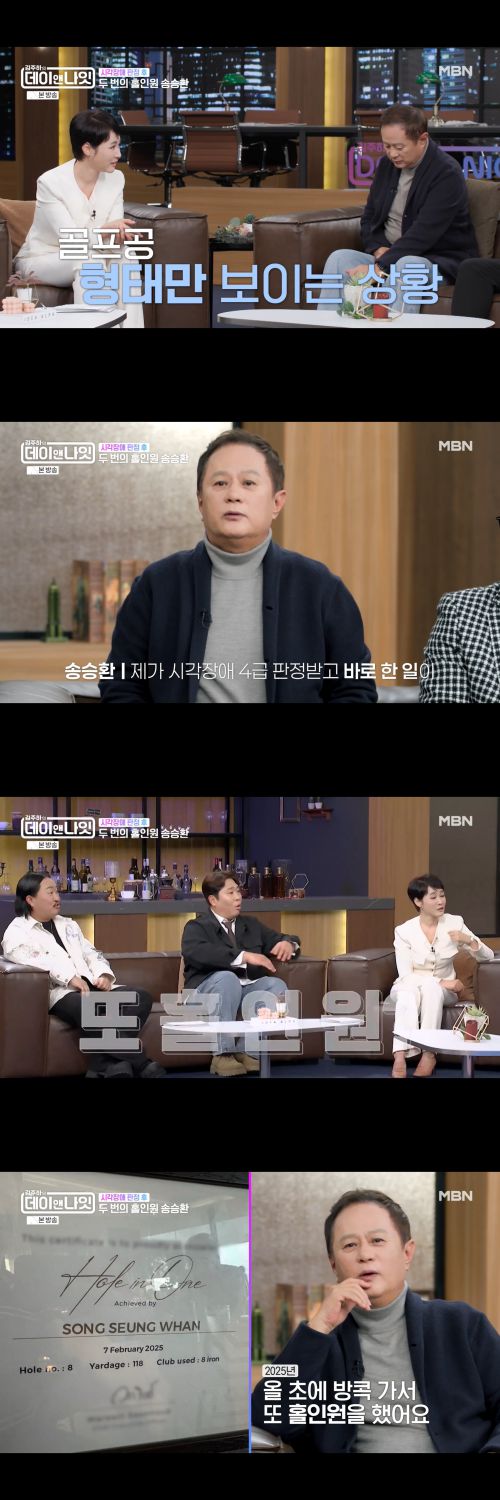 의외의 반전도 공개됐다. 송승환은 “시각장애 4급 판정을 받고 바로 한 일이 홀인원이었다”고 밝혀 출연진을 놀라게 했다. 그는 “올 초 방콕에 갔을 때도 홀인원을 한 번 더 했다”고 덧붙였다. 송승환은 “공이 흐릿하게 보이지만 골프는 결국 클럽 헤드가 공을 정확히 지나가면 된다”며 “헤드업도 하지 않는다. 어차피 잘 안 보이니까 공만 보고 쳤더니 옆에서 들어갔다고 하더라”고 웃었다. 이어 “눈이 나빠지고 오히려 골프는 좀 나아진 것 같다”고 농담했다.