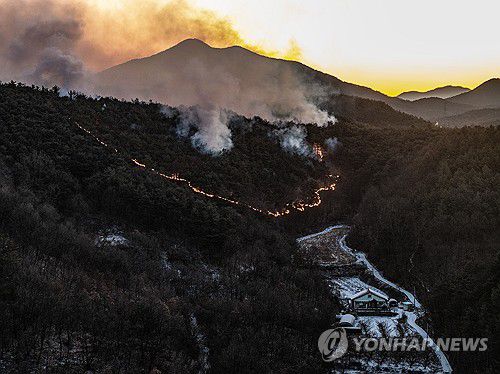 (의성=연합뉴스) 윤관식 기자 = 11일 경북 의성군 의성읍 팔성리 마을에 눈이 쌓인 가운데 인근 야산에서 전날 발생한 산불의 잔불이 남아 타오르고 있다. 2026.1.11