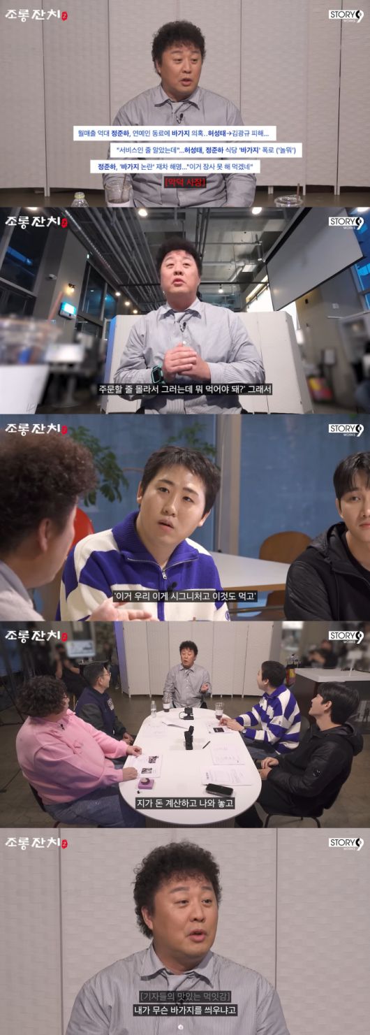 정준하는 "허성태가 가게에 와서 '형, 뭘 주문해야 할 지 모르겠다. 추천해달라'라고 하길래 시그니처 등을 추천해 줬다. 그리고 자기가 계산했으면서 내가 바가지를 씌웠다고 했다. 내가 무슨 바가지를 씌우냐고"라며 목에 핏대를 세웠다.