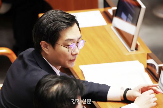 국회에서 지난해 12월30일 열린 본회의에서 장경태 더불어민주당 의원이 이야기를 나누고 있다. 한수빈 기자 |