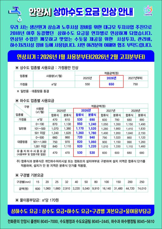[헤럴드경제(안양)=박정규 기자]안양시(시장 최대호)는 상하수도 생산원가 상승과 노후 시설 정비를 위한 대규모 투자 재원 확보를 위해 2026년 1월 사용분(2월 고지분)부터 상하수도 요금을 인상한다고 11일 밝혔다. 이번 인상은 고물가 상황 속에서 시민들의 경제적 부담을 최소화하기 위한 ‘단계적 현실화 계획’에 따른 것이다.
