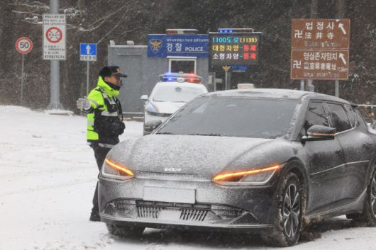 폭설이 쏟아진 11일 오전 제주시 어승생 삼거리 1100도로 입구에서 경찰이 차량 진입을 통제하고 있다. (사진=연합뉴스) |