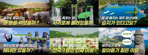 6개 릴레이 영상은 각각 똥돼지와 폭포, 람사르습지, 해녀, 메밀, 제주어를 주제로 구성했다. 각 영상엔 ‘제주도의 똥돼지는 왜 똥을 먹었을까?’ ‘제주도의 폭포는 왜 서귀포에 몰려 있을까?’ ‘물이 잘 빠지는 제주 화산섬에 습지가 있다고요?’ ‘제주도엔 왜 해남은 없고 해녀만 있을까?’ ‘제주도 메밀 생산량이 전국 1등인 진짜 이유’ ‘제주어가 알아듣기 힘든 이유’와 같은 부제를 달아 흥미와 재미를 더했다.