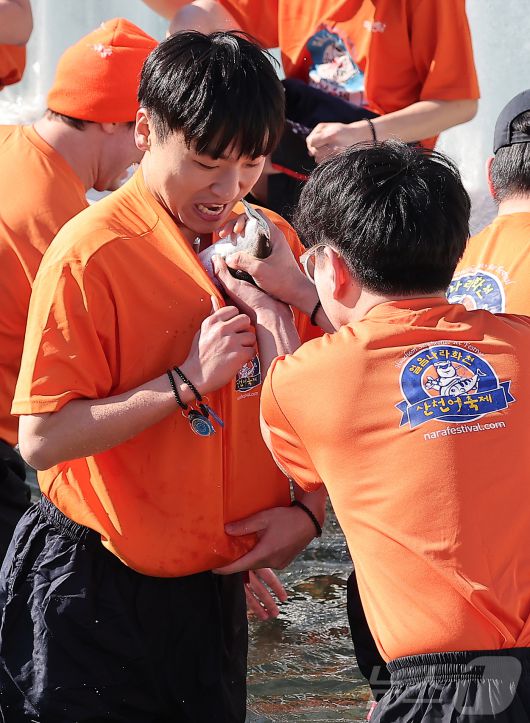 (화천=뉴스1) 김진환 기자 = 11일 강원 화천군 화천읍 화천산천어축제장에서 열린 2026 화천산천어축제를 찾은 관광객들이 산천어 맨손 잡기를 체험하고 있다. 국내 대표 겨울 축제인 2026 화천산천어축제는 10일부터 오는 2월 1일까지 23일간 열린다. 2026.1.11/뉴스1