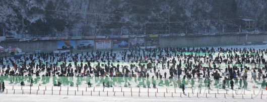 (화천=뉴스1) 김진환 기자 = 11일 강원 화천군 화천읍 화천산천어축제장에서 열린 2026 화천산천어축제를 찾은 관광객들이 얼음낚시를 즐기고 있다. 국내 대표 겨울 축제인 2026 화천산천어축제는 10일부터 오는 2월 1일까지 23일간 열린다. 2026.1.11/뉴스1