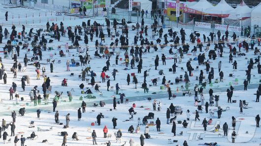 (화천=뉴스1) 김진환 기자 = 11일 강원 화천군 화천읍 화천산천어축제장에서 열린 2026 화천산천어축제를 찾은 관광객들이 얼음낚시를 즐기고 있다. 국내 대표 겨울 축제인 2026 화천산천어축제는 10일부터 오는 2월 1일까지 23일간 열린다. 2026.1.11/뉴스1