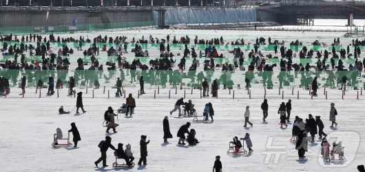 (화천=뉴스1) 김진환 기자 = 11일 강원 화천군 화천읍 화천산천어축제장에서 열린 2026 화천산천어축제를 찾은 관광객들이 얼음낚시를 즐기고 있다. 국내 대표 겨울 축제인 2026 화천산천어축제는 10일부터 오는 2월 1일까지 23일간 열린다. 2026.1.11/뉴스1