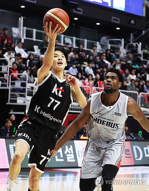 (수원=연합뉴스) 홍기원 기자 = 11일 경기도 수원KT소닉붐아레나에서 열린 프로농구 수원 KT 소닉붐과 울산 현대모비스 피버스의 경기. KT 강성욱이 슛하고 있다. 2026.1.11