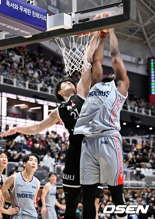 [OSEN=수원, 민경훈 기자] 11일 오후 수원 KT 소닉붐 아레나에서 2025-2026 LG전자 프로농구 수원 KT 소닉붐과 울산 현대모비스 피버스의 경기가 열렸다. 수원 KT는 15승 16패로 6위, 울산 현대모비스는 10승 20패로 8위를 기록 중이다. 1쿼터 KT 이두원이 현대모비스 이그부누에게 파울을 범하고 있다. 2026.01.11 /rumi@osen.co.kr