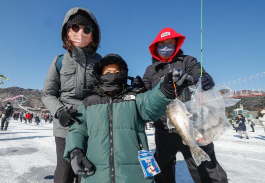 11일 강원 화천군 화천읍 화천천 일대에서 2026 얼음나라화천 산천어축제가 열린 가운데 행사장을 찾은 외국인 관광객 가족이 낚아올린 산천어를 들어보이고 있다. |