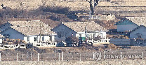 (인천=연합뉴스) 임순석 기자 = 11일 인천 강화군 강화평화전망대에서 바라본 북한 황해북도 개풍군 마을에서 주민들이 트랙터를 이용 거름을 옮기고 있다. 북한 김여정 노동당 부부장은 이날 조선중앙통신 담화를 통해 한국발 무인기가 북한 영공을 침범했다며 책임을 경고했다. 2026.1.11