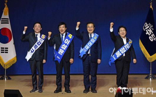 아시아투데이 송의주 기자 = 강득구(왼쪽부터)·이성윤·이건태·문정복 더불어민주당 최고위원 후보가 11일 국회 의원회관에서 열린 최고위원 보궐선거 후보자 합동연설회에서 당원들에게 인사하고 있다. ⓒ "젊은 파워, 모바일 넘버원 아시아투데이"