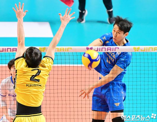(엑스포츠뉴스 장충, 김한준 기자) 11일 오후 서울 장충체육관에서 열린 '진에어 2025-2026 V-리그' 우리카드와 KB손해보험의 경기, 우리카드 한성정이 공격을 시도하고 있다.김한준 기자 kowel@xportsnews.com