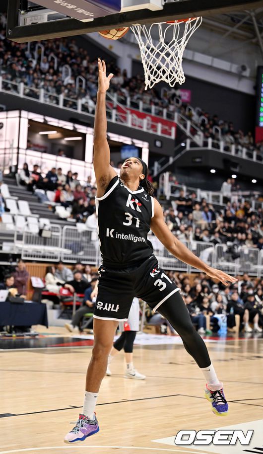 [OSEN=수원, 민경훈 기자] 11일 오후 수원 KT 소닉붐 아레나에서 2025-2026 LG전자 프로농구 수원 KT 소닉붐과 울산 현대모비스 피버스의 경기가 열렸다. 수원 KT는 15승 16패로 6위, 울산 현대모비스는 10승 20패로 8위를 기록 중이다. 4쿼터 KT 힉스가 속공에 성공하고 있다. 2026.01.11 /rumi@osen.co.kr