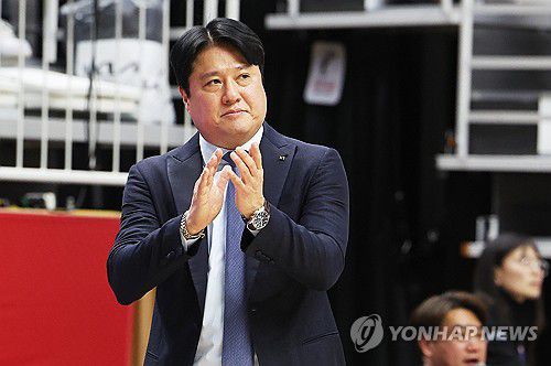 (수원=연합뉴스) 홍기원 기자 = 11일 경기도 수원KT소닉붐아레나에서 열린 프로농구 수원 KT 소닉붐과 울산 현대모비스 피버스의 경기. KT 문경은 감독이 선수들을 독려하고 있다. 2026.1.11