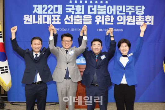 [이데일리 노진환 기자] 한병도(왼쪽부터), 진성준, 박정, 백혜련 더불어민주당 원내대표 후보가 11일 서울 여의도 국회에서 열린 제22대 국회 더불어민주당 원내대표 선출을 위한 의원총회에서 손을 들어 의원들에게 인사하고 있다.