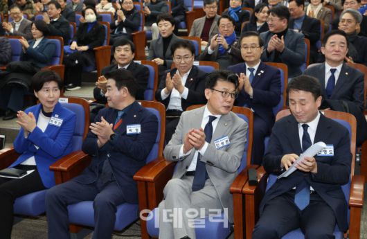 [이데일리 노진환 기자] 한병도(앞줄 오른쪽부터), 진성준, 박정, 백혜련 더불어민주당 원내대표 후보가 11일 서울 여의도 국회에서 열린 제22대 국회 더불어민주당 원내대표 선출을 위한 의원총회에 참석해 대화하고 있다.
