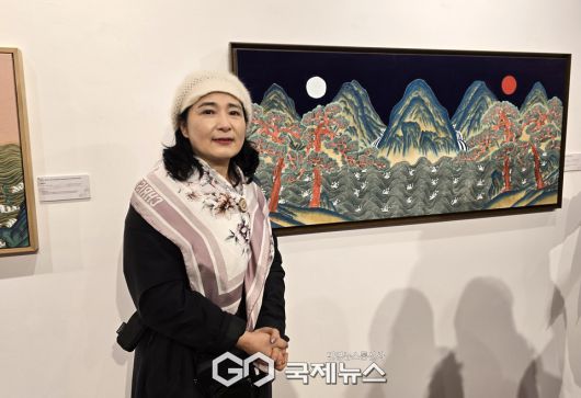 (부탄=국제뉴스) 유지현 기자 = 9일 부탄 팀푸시 RTA에서 '제2회 부탄 국제 ESG 동맹포럼' 부대행사로 열린 '부탄왕국 초청 한국 전통 민화전' 개막식에서 일월오봉도를 소개하는 돌담 황성숙 작가.