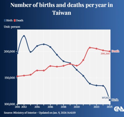 대만 전체 인구는 202년 처음으로 감소했으며 출산율은 20년 동안 지속해서 하락하고 있다고 CNA는 지적했다.
