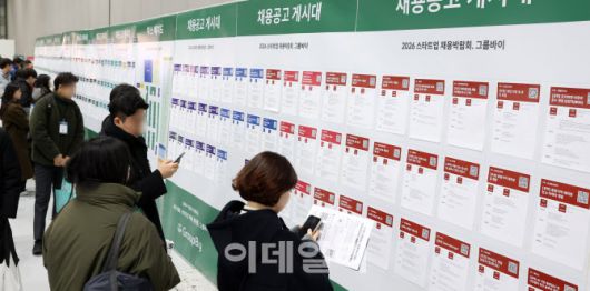 [이데일리 방인권 기자] 11일 서울 강남구 코엑스에서 열린 ‘2026 스타트업 채용박람회’를 찾은 구직자들이 채용공고 게시대를 살펴보고 있다.