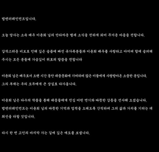 이어 "이윤희 님은 배우로서 오랜 시간 동안 대중문화에 기여하며 많은 이들에게 사랑받아온 소중한 분”이라며 “그의 부재는 우리 모두에게 큰 상실로 다가옵니다"라고 황망한 심경을 드러냈다.