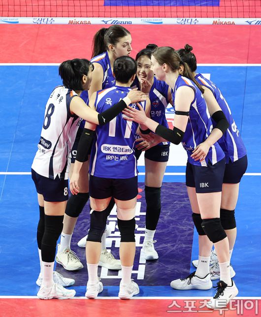[화성(경기)=스포츠투데이 권광일 기자] 2025-2026 진에어 V-리그 여자부 IBK기업은행-현대건설 경기가 11일 경기도 화성시 화성종합경기타운에서 열렸다. IBK기업은행 선수들이 득점 성공에 기뻐하고 있다. 2026.01.11. [스포츠투데이 권광일 기자 sports@stoo.com]