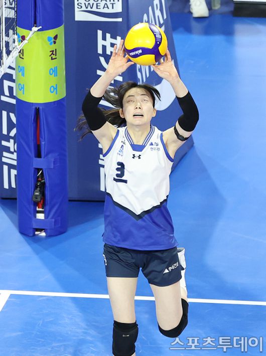 [화성(경기)=스포츠투데이 권광일 기자] 2025-2026 진에어 V-리그 여자부 IBK기업은행-현대건설 경기가 11일 경기도 화성시 화성종합경기타운에서 열렸다. 현대건설 김다인이 토스를 올리고 있다. 2026.01.11. [스포츠투데이 권광일 기자 sports@stoo.com]