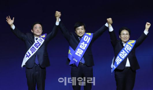 [이데일리 노진환 기자] 11일 서울 여의도 국회 의원회관에서 더불어민주당 최고위원 보궐선거 후보자 합동연설회가 열렸다. 최고위원에 당선된 강득구(왼쪽부터), 이성윤, 문정복 더불어민주당 의원이 손을 들어 인사하고 있다.