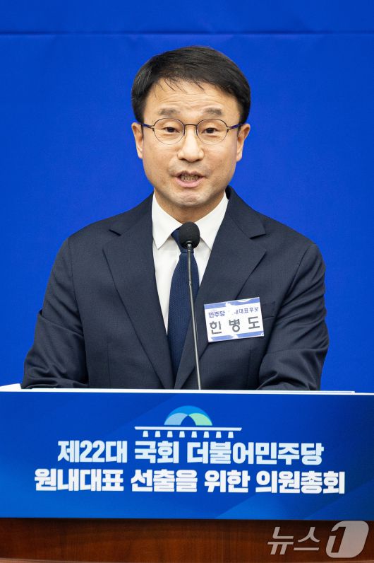 (서울=뉴스1) 유승관 기자 = 더불어민주당 원내대표 보궐선거 결선에 진출한 한병도 후보가 11일 서울 여의도 국회에서 열린 제22대 국회 더불어민주당 원내대표 선출을 위한 의원총회에서 결선투표를 앞두고 추가 정견발표를 하고 있다. 2026.1.11/뉴스1