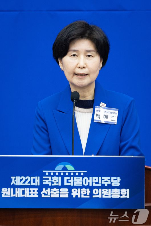 (서울=뉴스1) 유승관 기자 = 더불어민주당 원내대표 보궐선거 결선에 진출한 백혜련후보가 11일 서울 여의도 국회에서 열린 제22대 국회 더불어민주당 원내대표 선출을 위한 의원총회에서 결선투표를 앞두고 추가 정견발표를 하고 있다. 2026.1.11/뉴스1